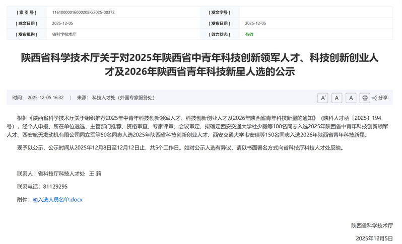 公示来源:https://kjt.shaanxi.gov.cn/kjdt/tzgg/202512/t20251205_3593023.html