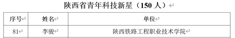 近日,陕西省科学技术厅发布了《关于对2025年陕西省中青年科技创新领军人才、科技创新创业人才及2026年陕西省青年科技新星人选的公示》,我校教师李骏博士拟入选“2026年陕西省青年科技新星”。